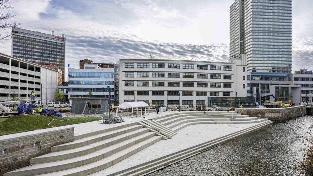 Okolí krajského sídla, které dřív sloužilo hlavně jako parkoviště, se změnilo v prostor k relaxaci i setkávání, obnovy se dočkal zanedbaný park. Krajský úřad dostal nový přímý vstup přes lávku, se kterou počítal už původní projekt architekta Zdeňka Plesníka na konci 60. let minulého století. Schodiště umožňuje návštěvníkovi sejít k řece a namočit si nohy ve vodě. Přibyl stánek s občerstvením a toaletami, vodní prvek i dětské hřiště, nábřeží zdobí plastika Magdaleny Jetelové v podobě čtyř obřích nohou. Náplavka přišla kraj na 155 milionů korun.