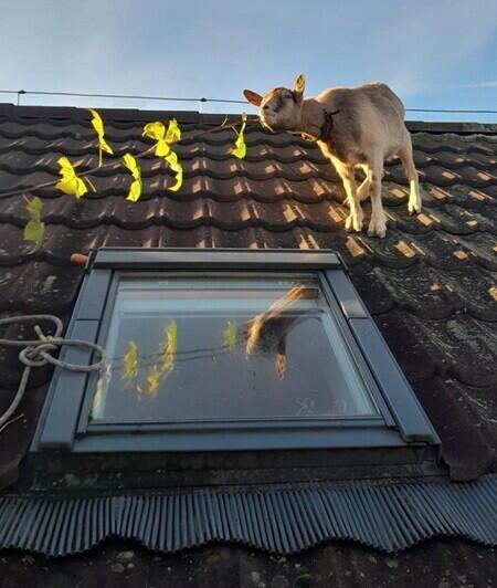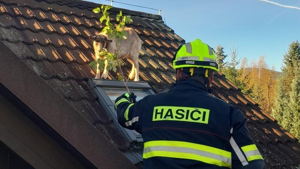 Koza se před psem spasila úprkem na střechu. Zachránili jí hasiči, nalákali jí na mrkev, jablko i listy