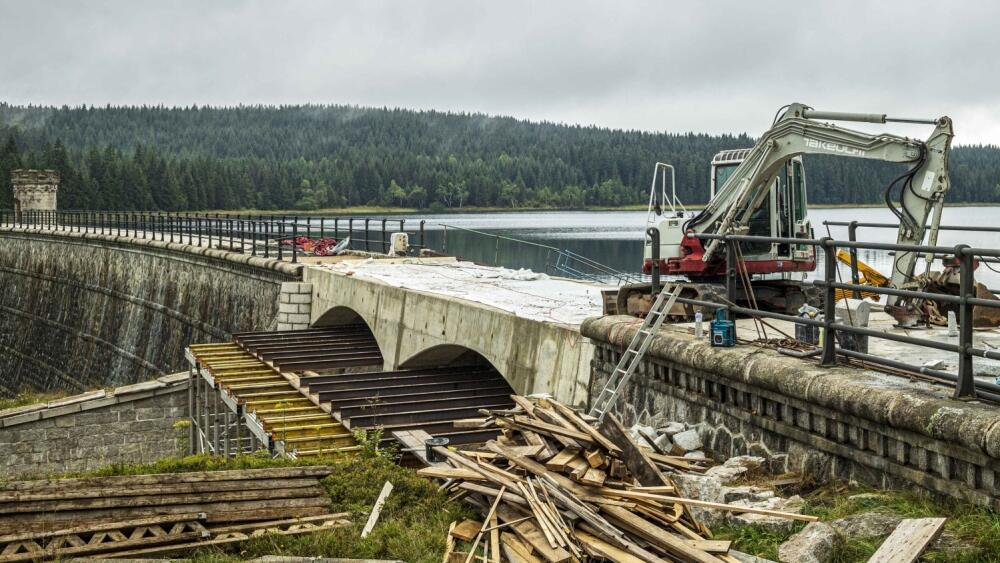 Turisté už znovu přejdou přes hráz přehrady na Černé Nise v Bedřichově v Jizerských horách. Korunu hráze stavbaři opravovali od jara roku 2019.