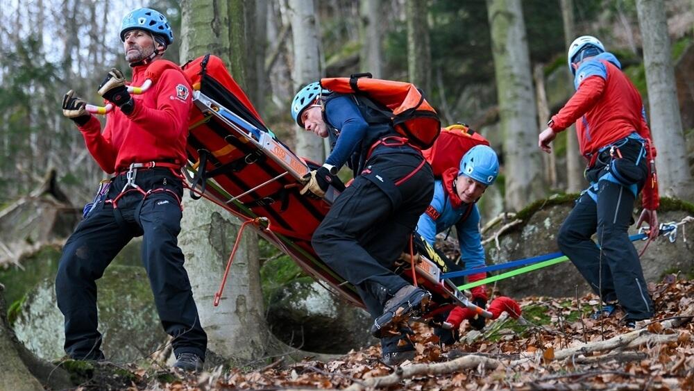 Horští záchranáři z Jizerek trénovali transport raněného horolezce na jedné ze skalních věží v Jizerskohorských bučinách jménem Čarostřelec.