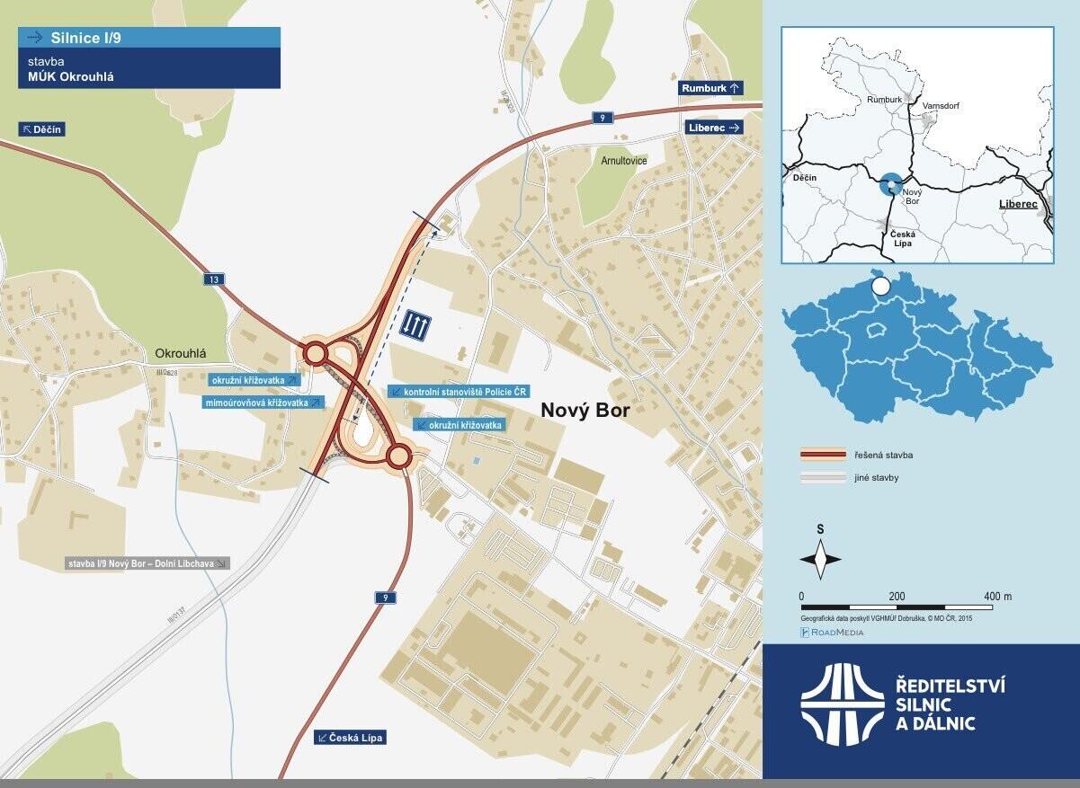Křižovatkou mezi Novým Borem a Okrouhlou projede denně podle loňského sčítání dopravy zhruba 10.500 aut. Stavbaři upraví větve křižovatky, zbourat musí most a postavit nový, protože kvůli rozšíření I/9 je potřeba rozšířit nadjezd. "Součástí přestavby budou dvě protihlukové stěny, které ochrání obec Okrouhlá. Vybudujeme také kontrolní stanoviště Policie ČR pro vážení kamionů. Zohledňujeme rovněž bezpečnost, nové oplocení silnice ochrání migrující zvěř před střety s vozidly," uvedl generální ředitel ŘSD Radek Mátl.