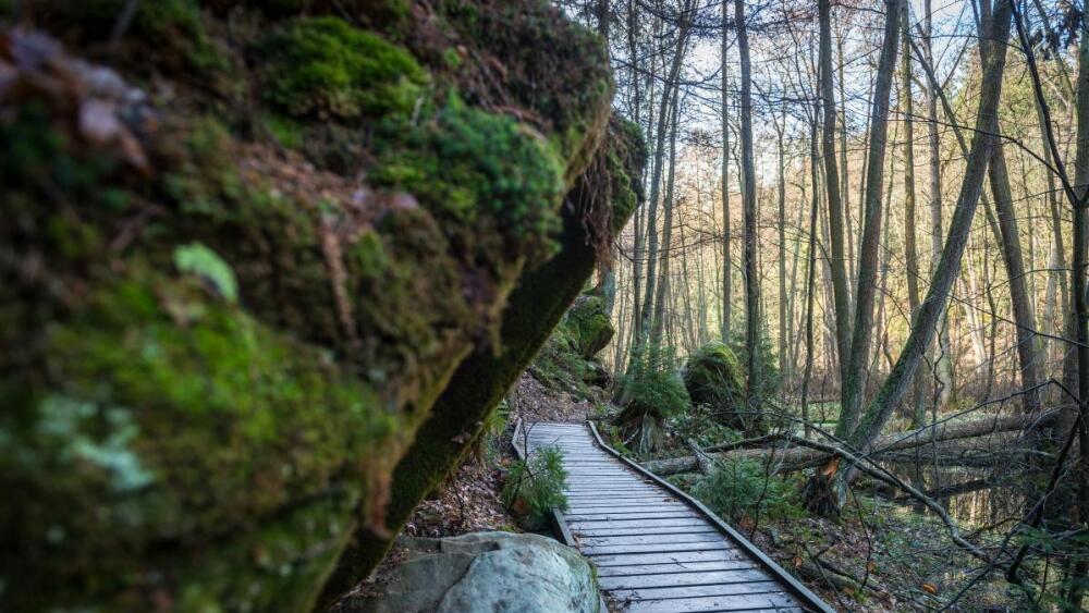 Naučná stezka, která vede romantickou nivou národní přírodní památky sleduje skalní převisy, prochází skalním tunelem i zamokřenými místy, která lze přejít pouze po dřevěných chodnících.