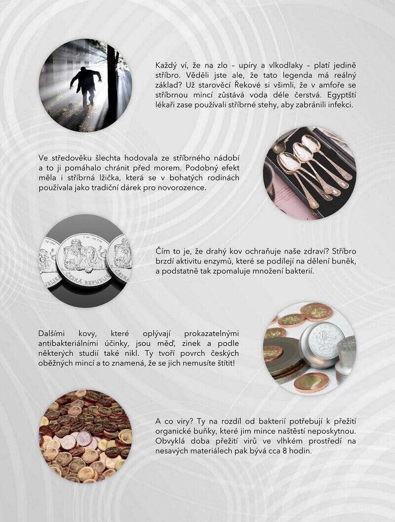 "Ve středověku šlechta hodovala ze stříbrného nádobí a to ji pomáhalo chránit před morem. Podobný efekt měla i stříbrná lžička, která se v bohatých rodinách používala jako tradiční dárek pro novorozence. Čím to je, že drahý kov ochraňuje naše zdraví? Stříbro brzdí aktivitu enzymů, které se podílejí na dělení buněk, a podstatně tak zpomaluje množení bakterií. Dalšími kovy, které oplývají prokazatelnými antibakteriálními účinky, jsou měď, zinek a podle některých studií také nikl. Ty tvoří povrch českých oběžných mincí a to znamená, že se jich nemusíte štítit," říká Jaroslav Černý z České mincovny.