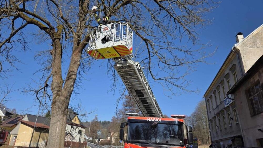 Papouška kakadu za desítky tisíc korun zachránili z koruny stromu v Dolním Kokoníně jablonečtí hasiči
