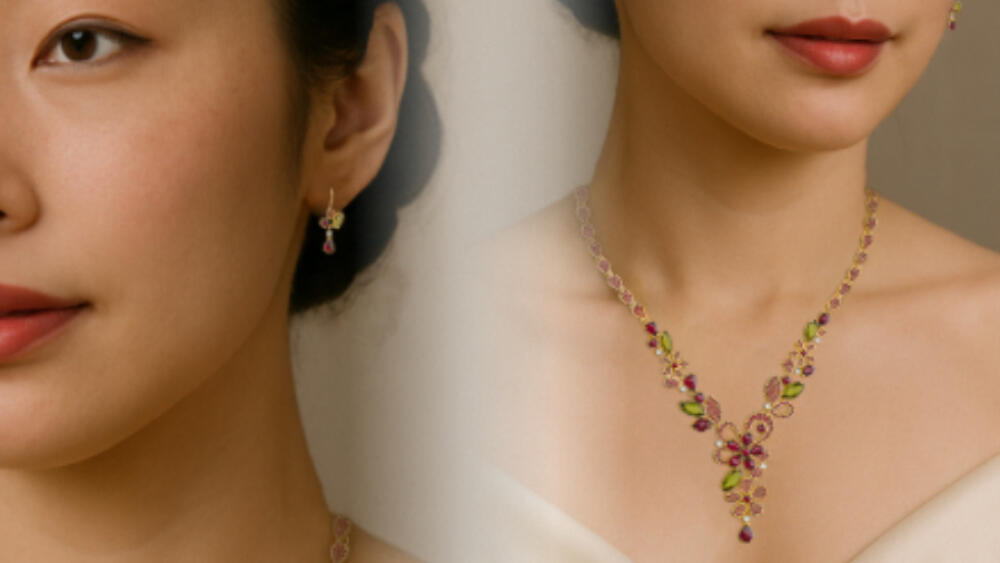 Soupravu tvoří náhrdelník a náušnice ze žlutého zlata o ryzosti 585/1000, osazené dvěma výjimečnými kameny s českým původem. Dominantní je český granát – jedinečný svou sytě rudou barvou a historickou hodnotou, který doplňuje zelený vltavín, přírodní sklo meteoritického původu. Třetím prvkem je diamant – kámen, který ve špercích zdůrazňuje jejich výjimečnost.